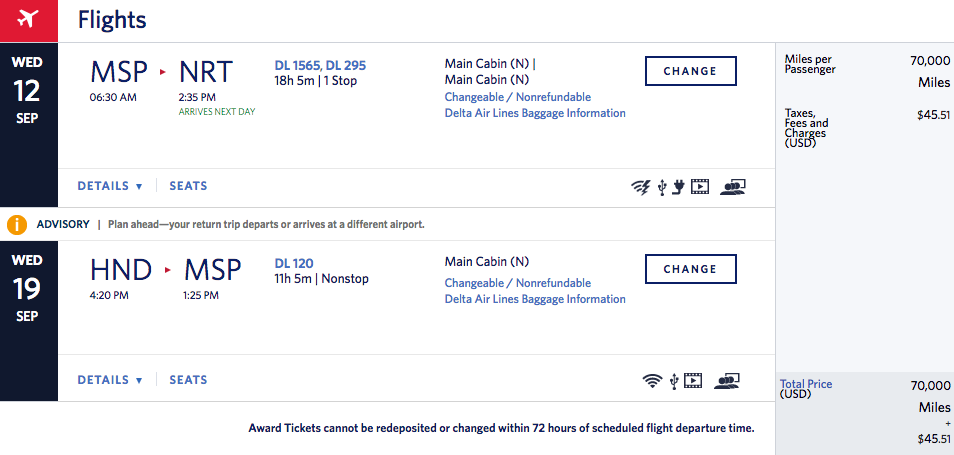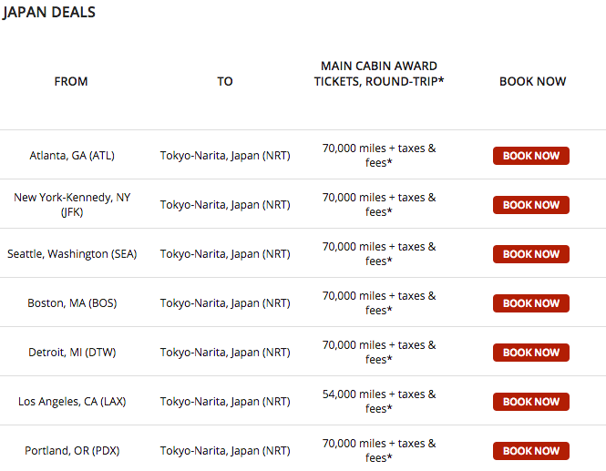 Detroit (DTW) to Tokyo Narita (NRT) for 70,000 miles + $46 in taxes and fees round-trip nonstop: