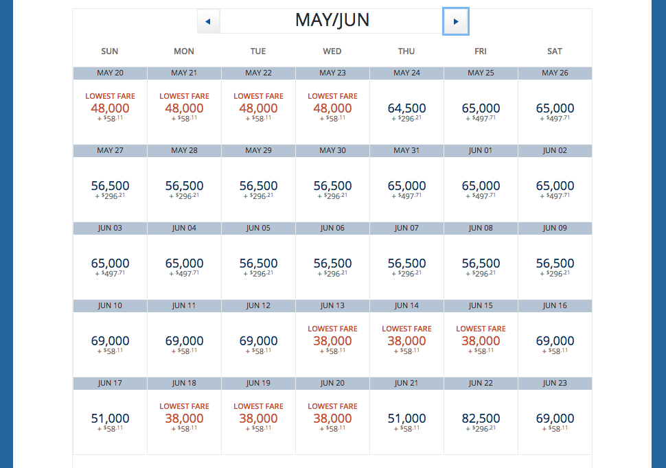 Cost: 38,000+ SkyMiles and $59+ in taxes round-trip