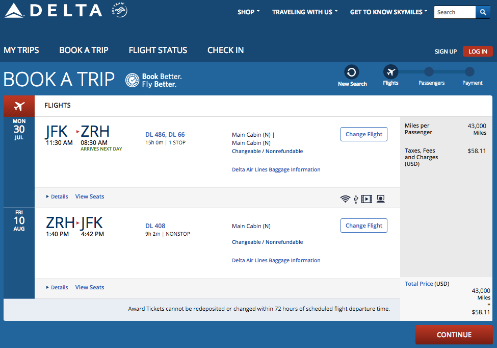 New York (JFK) to Zurich (ZRH) for 43,000 SkyMiles and $59 in taxes in July/August: