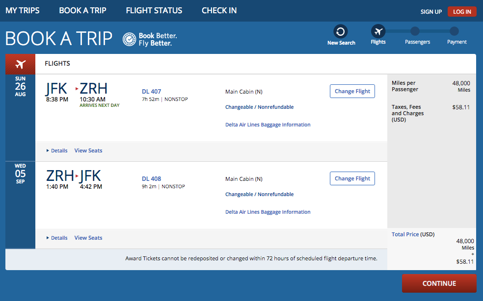 New York (JFK) to Zurich (ZRH) for 48,000 SkyMiles and $59 in taxes in August/September: