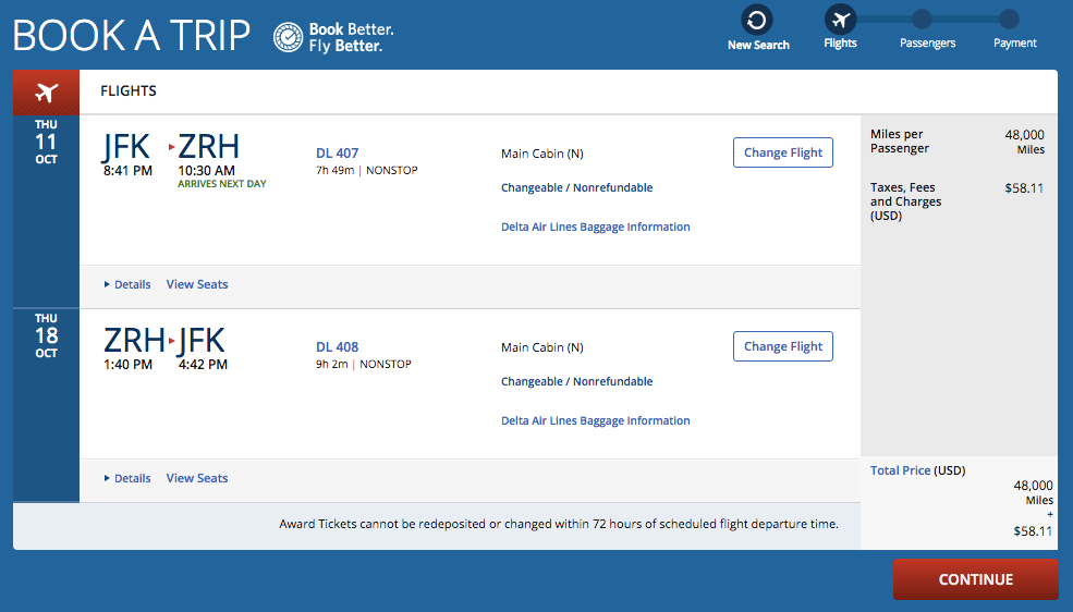 New York (JFK) to Zurich (ZRH) for 48,000 SkyMiles and $59 in taxes in October: