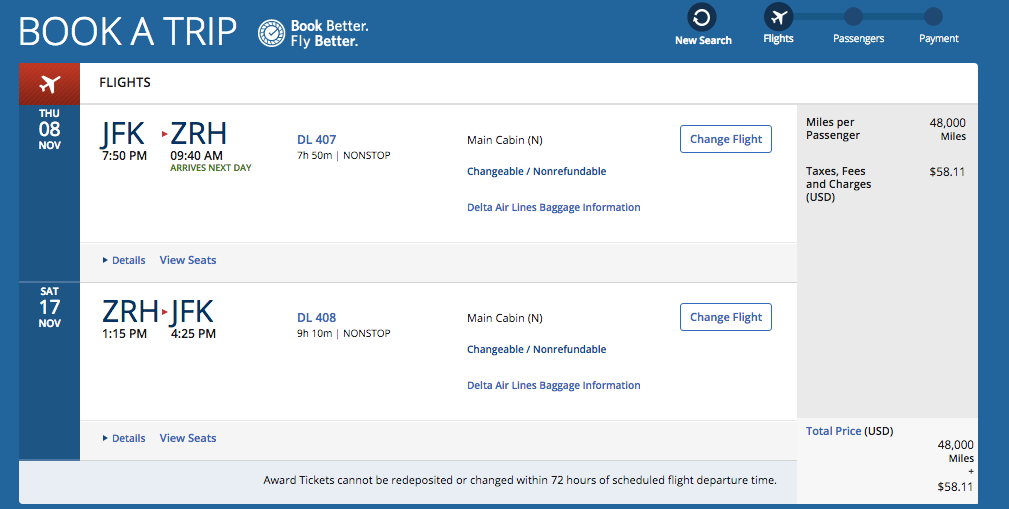 New York (JFK) to Zurich (ZRH) for 48,000 SkyMiles and $59 in taxes in November: