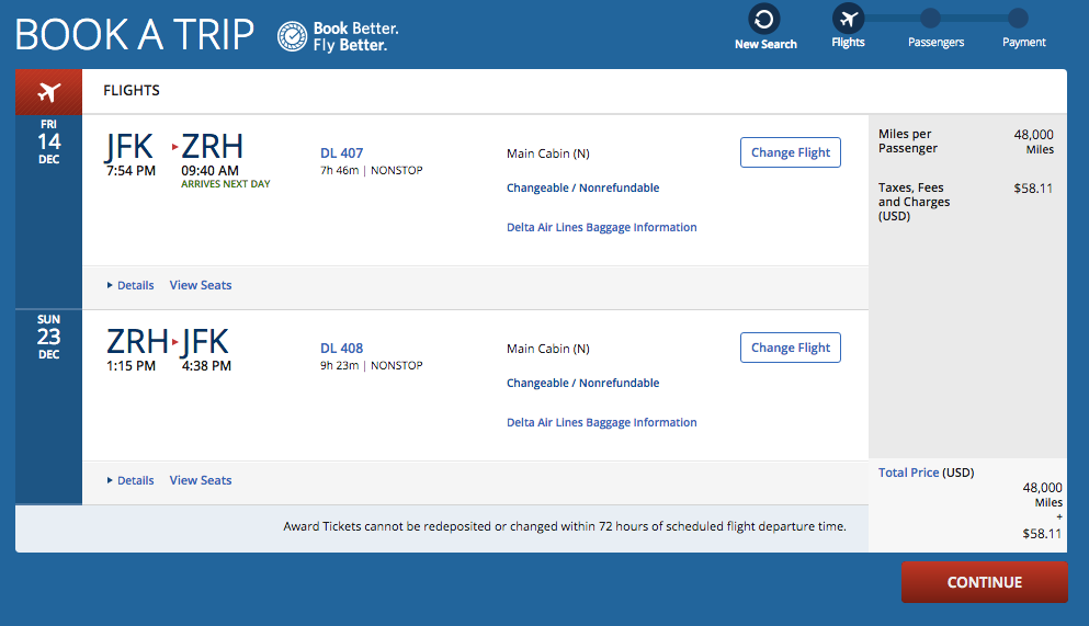 New York (JFK) to Zurich (ZRH) for 48,000 SkyMiles and $59 in taxes in December: