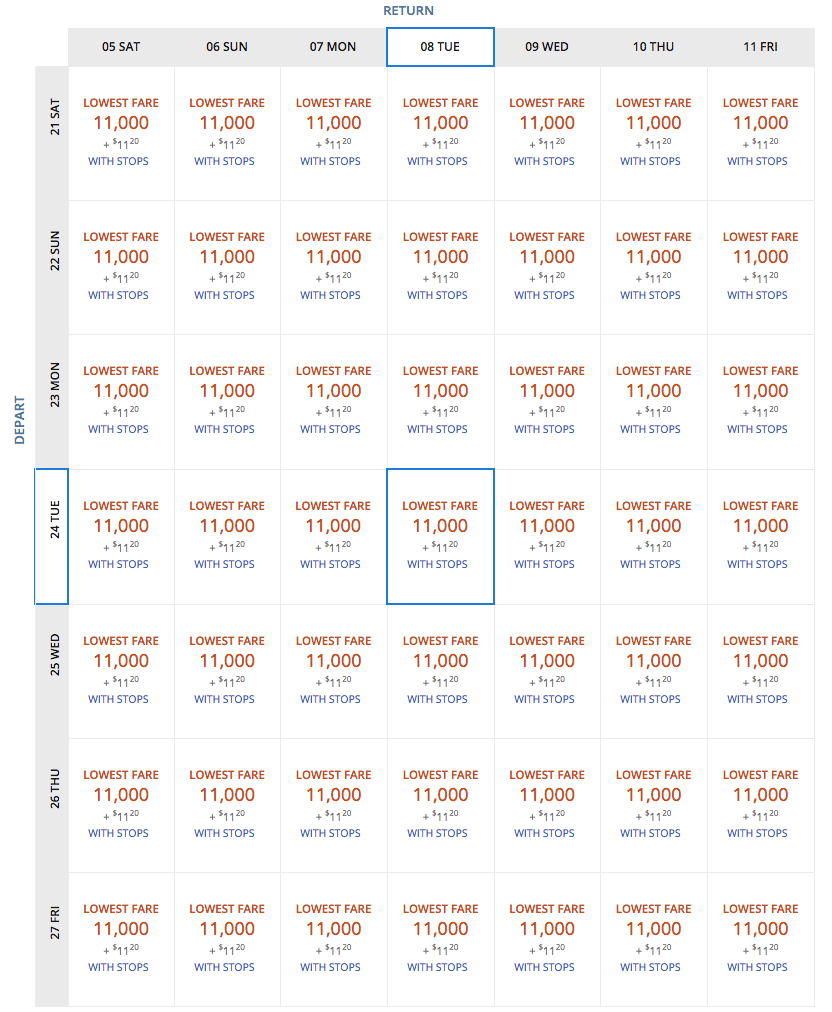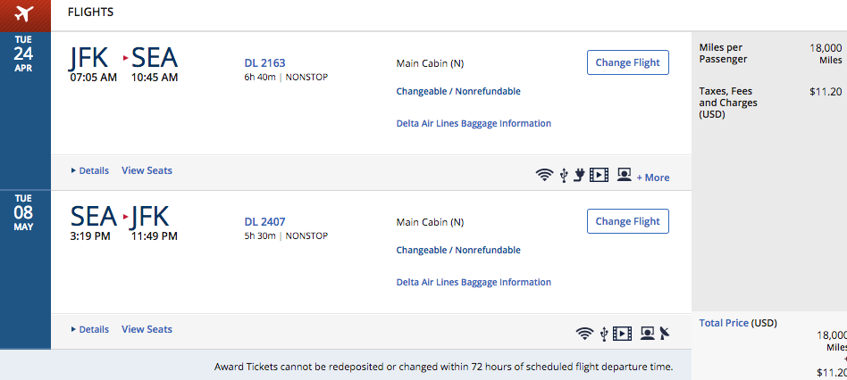 There are also some great transcontinental deals, like 18,000 miles round-trip for New York (JFK) to Seattle (SEA) plus $11.20. This usually would go for a minimum of 25,000 miles.