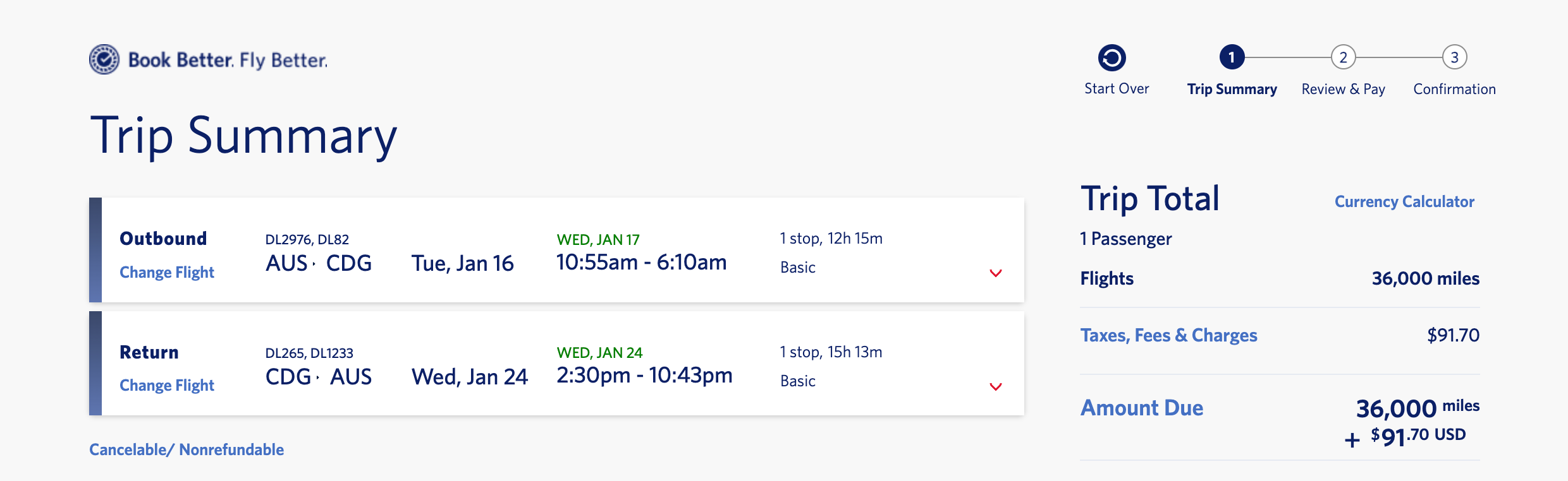 - Austin-Bergstrom International Airport (AUS) to CDG for 36,000 SkyMiles