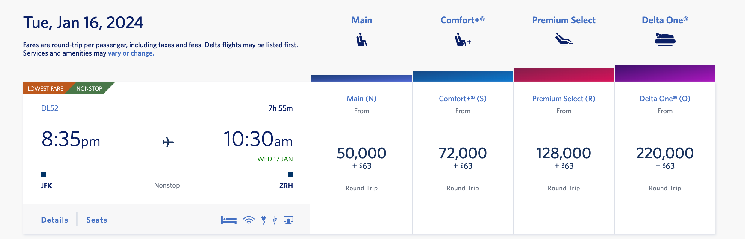 For example, look at this nonstop flight from New York City to Zurich in January. You can spend a week in Switzerland for 34,000 SkyMiles plus $62 in taxes and fees.