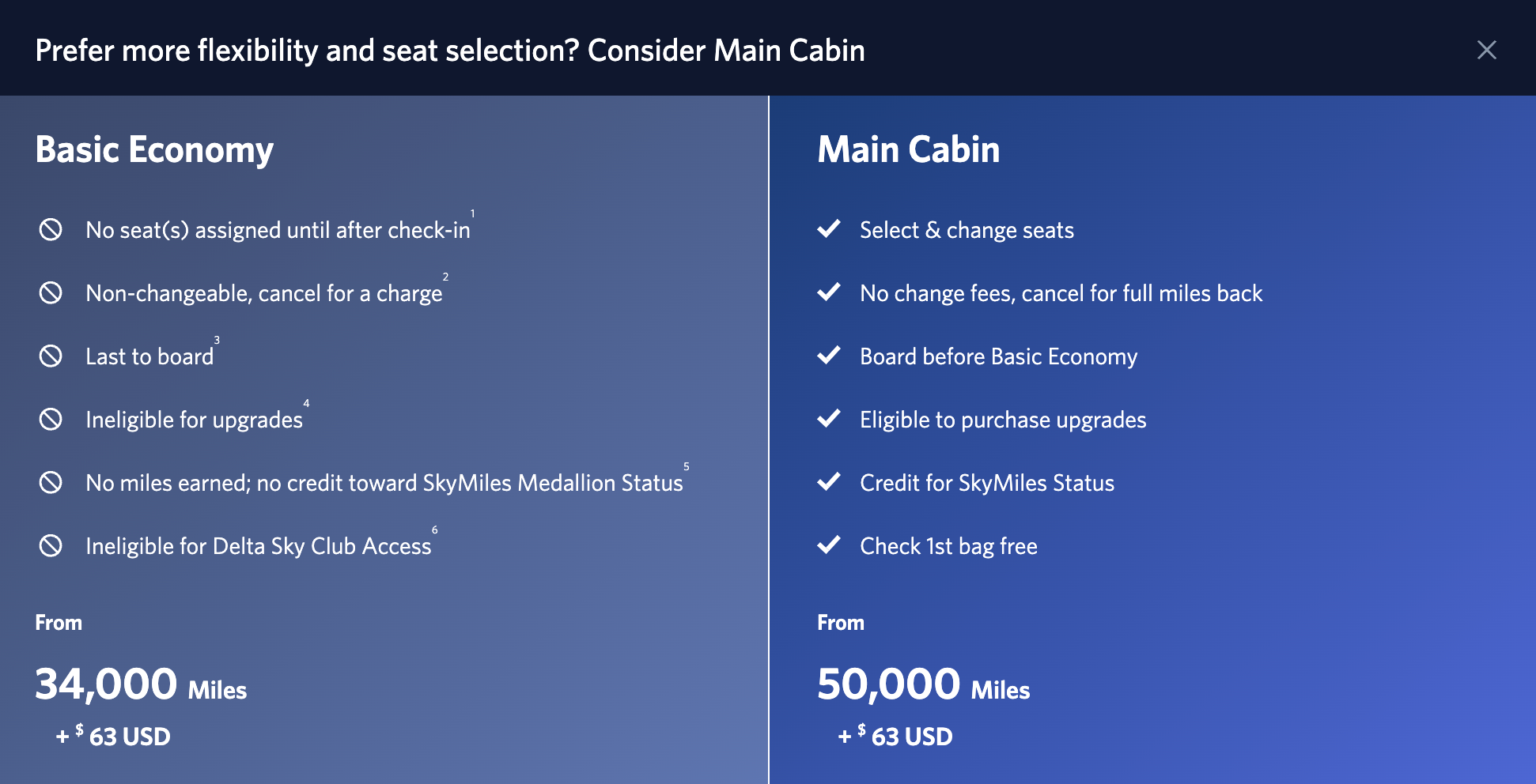 For a Main Cabin ticket on the same flight, you'll have to hand over 16,000 more SkyMiles. In return, you can select your seats in advance and make changes to your reservation without paying a fee.