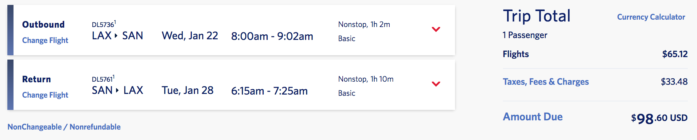 Los Angeles (LAX) to San Diego (SAN) for $99 round-trip in basic economy: