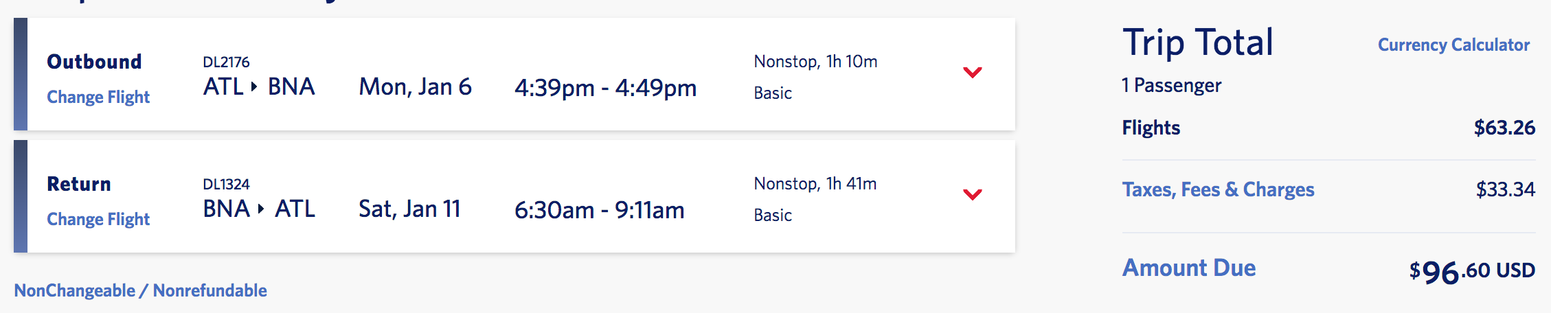 Atlanta (ATL) to Nashville (BNA) for $97 round-trip in basic economy: