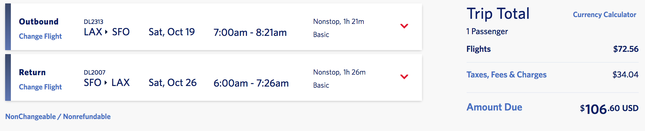 Los Angeles (LAX) to San Francisco (SFO) for $107 round-trip in basic economy: