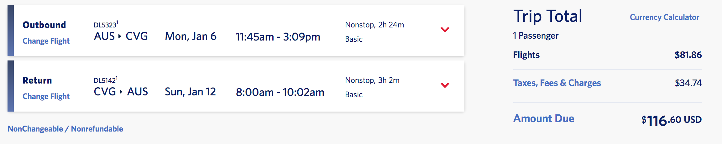 Austin (AUS) to Cincinnati (CVG) for $117 round-trip in basic economy: