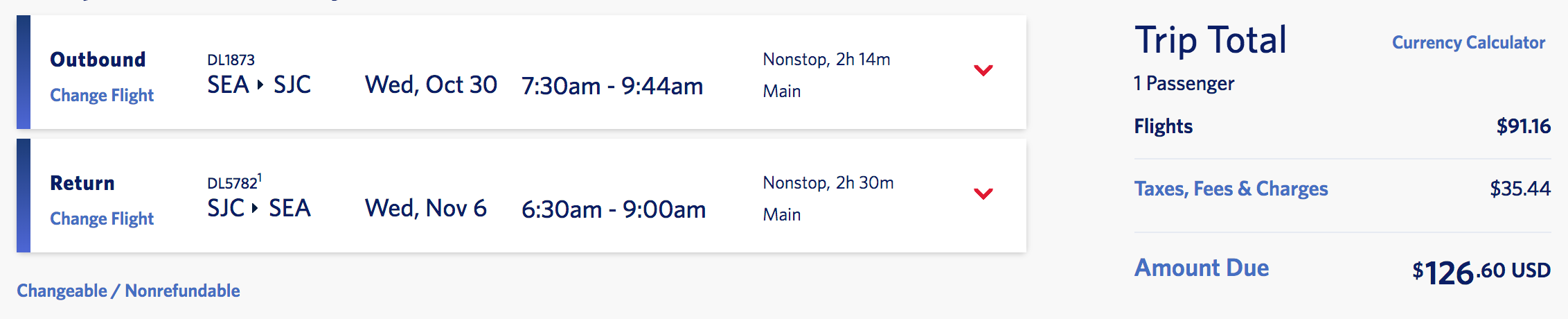 Seattle (SEA) to San Jose (SJC) for $127 round-trip in Main Cabin: