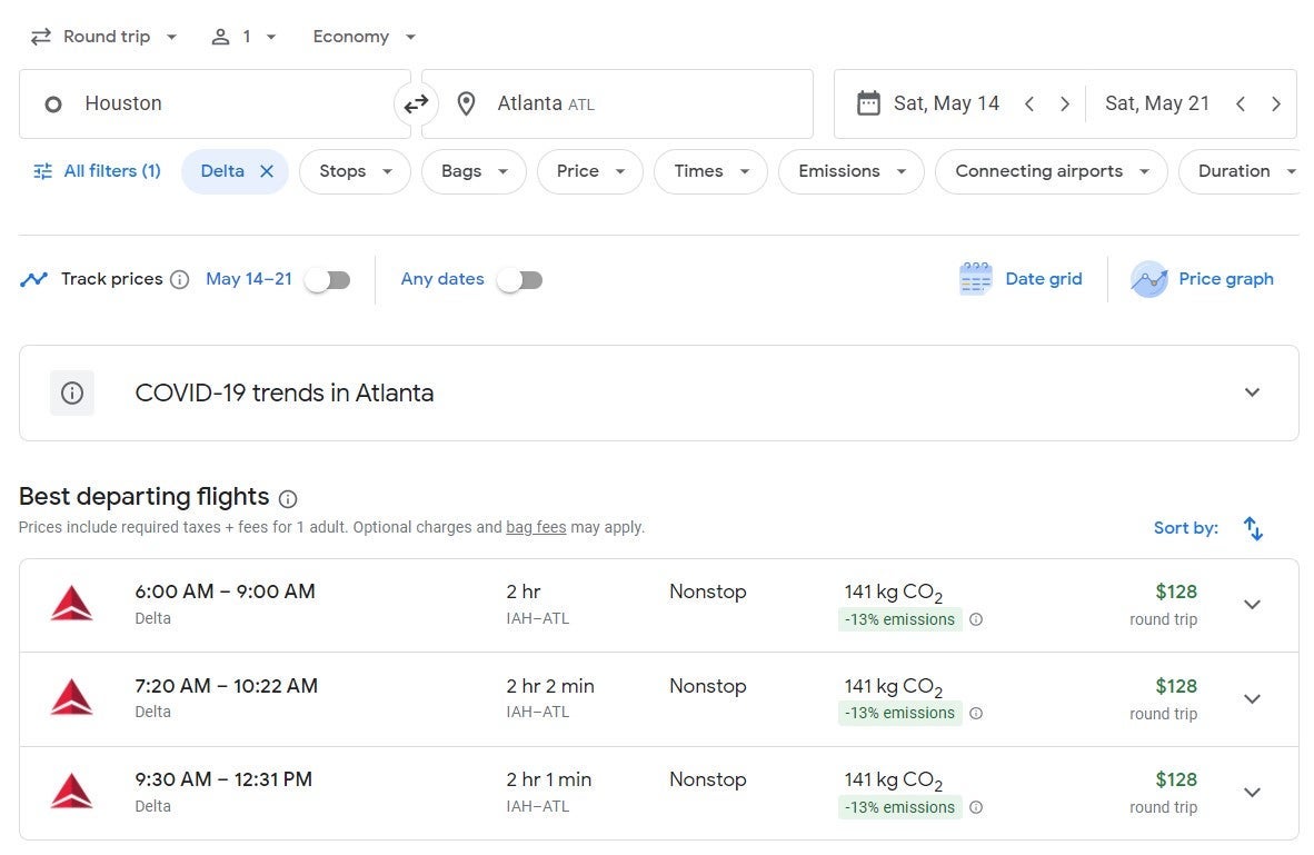 There is also broad availability for flights from Houston (IAH) to Atlanta (ATL) priced at $128 round-trip.