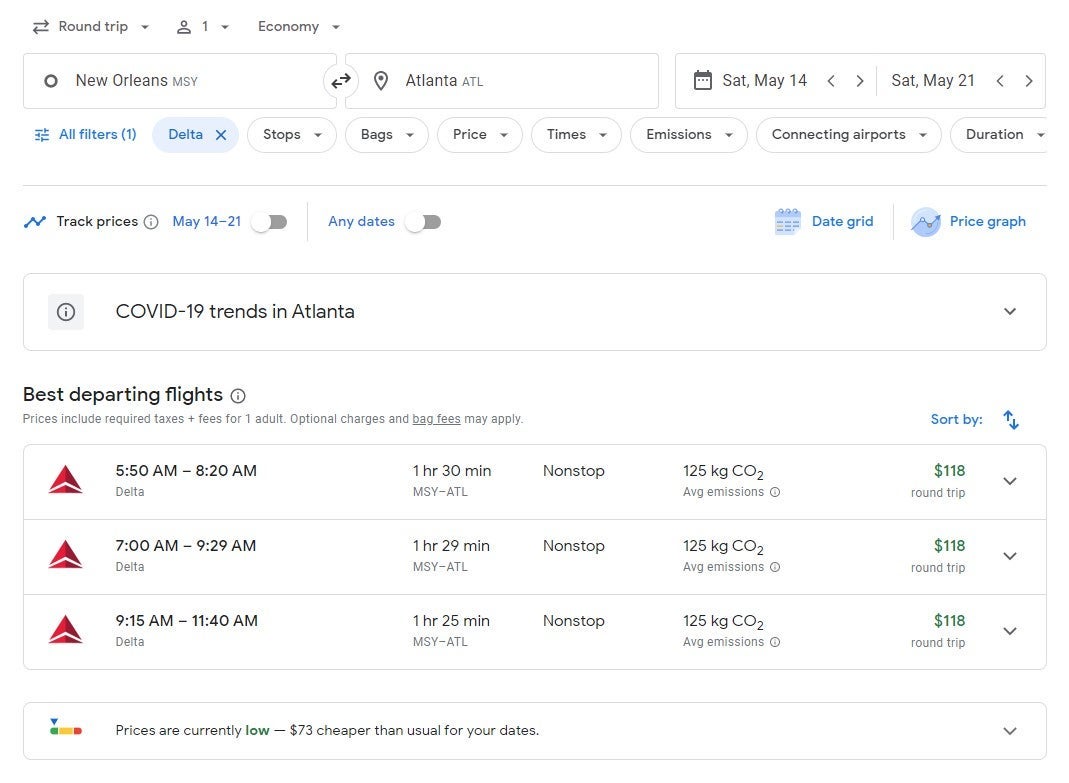 Travelers can go from New Orleans (MSY) to Atlanta (ATL) for $118 round-trip with a variety of flight options via Delta at this price.