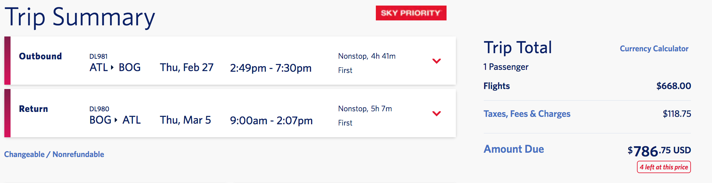 Atlanta (ATL) to Bogota (BOG) for $787 round-trip nonstop in first class: