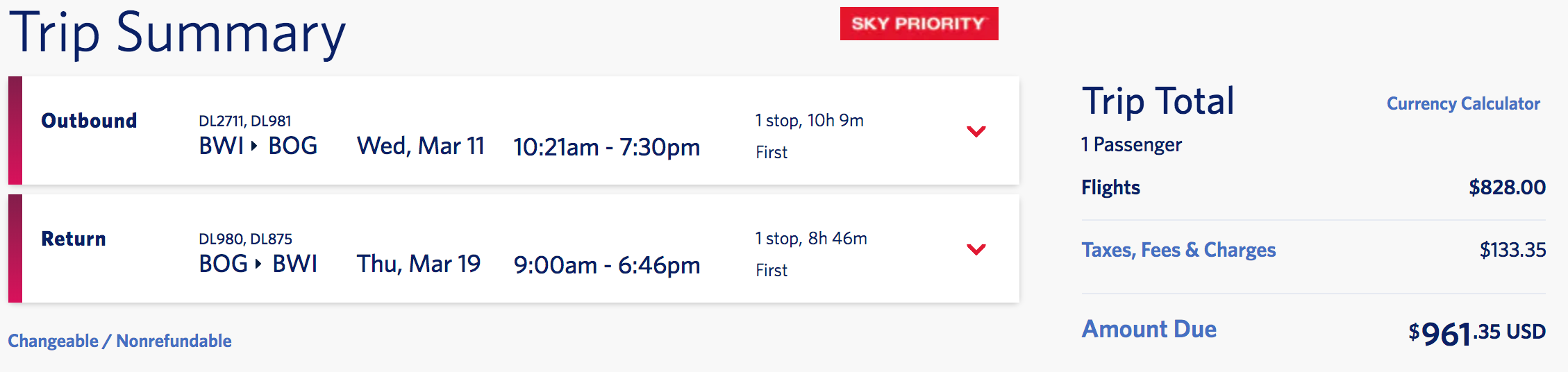 Baltimore (BWI) to Bogota (BOG) for $961 round-trip in first: