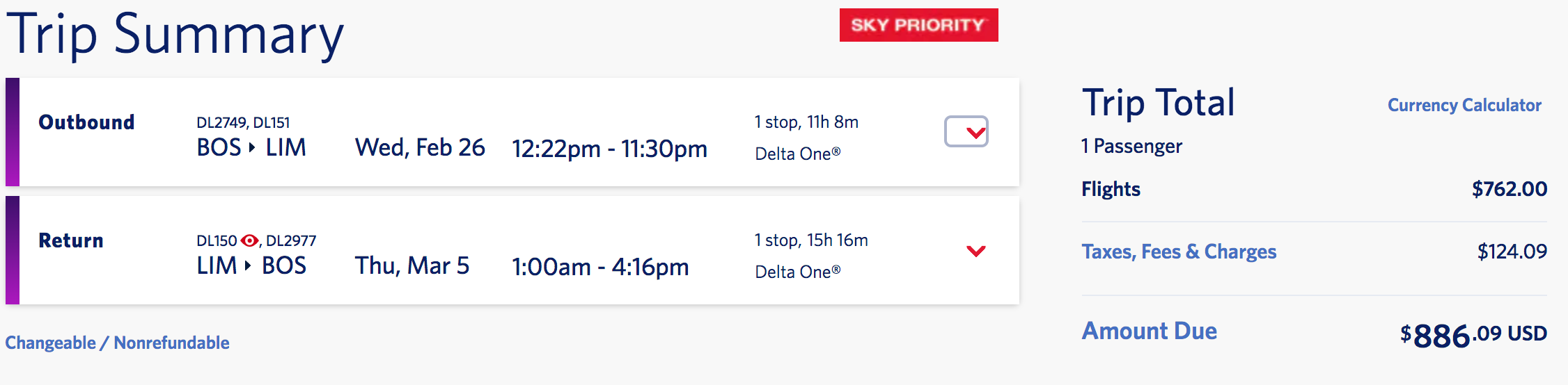 Boston (BOS) to Lima (LIM) for $886 round-trip in Delta One:
