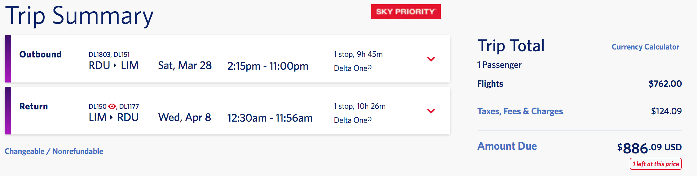 Raleigh (RDU) to Lima (LIM) for $886 round-trip in Delta One: