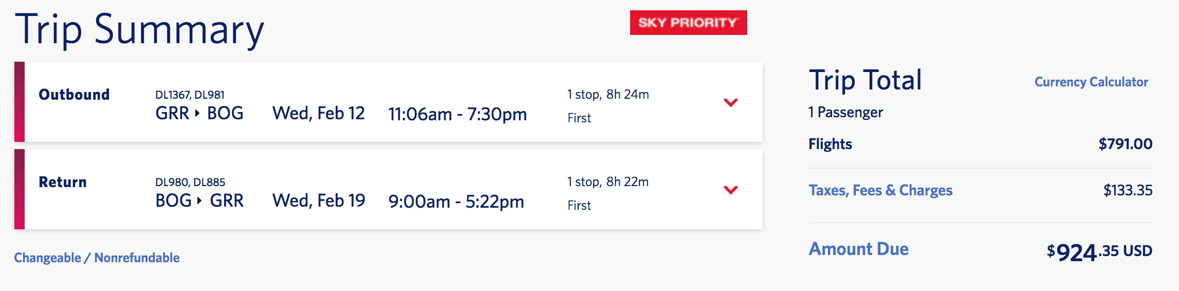 Grand Rapids (GRR) to Bogota (BOG) for $924 round-trip in first: