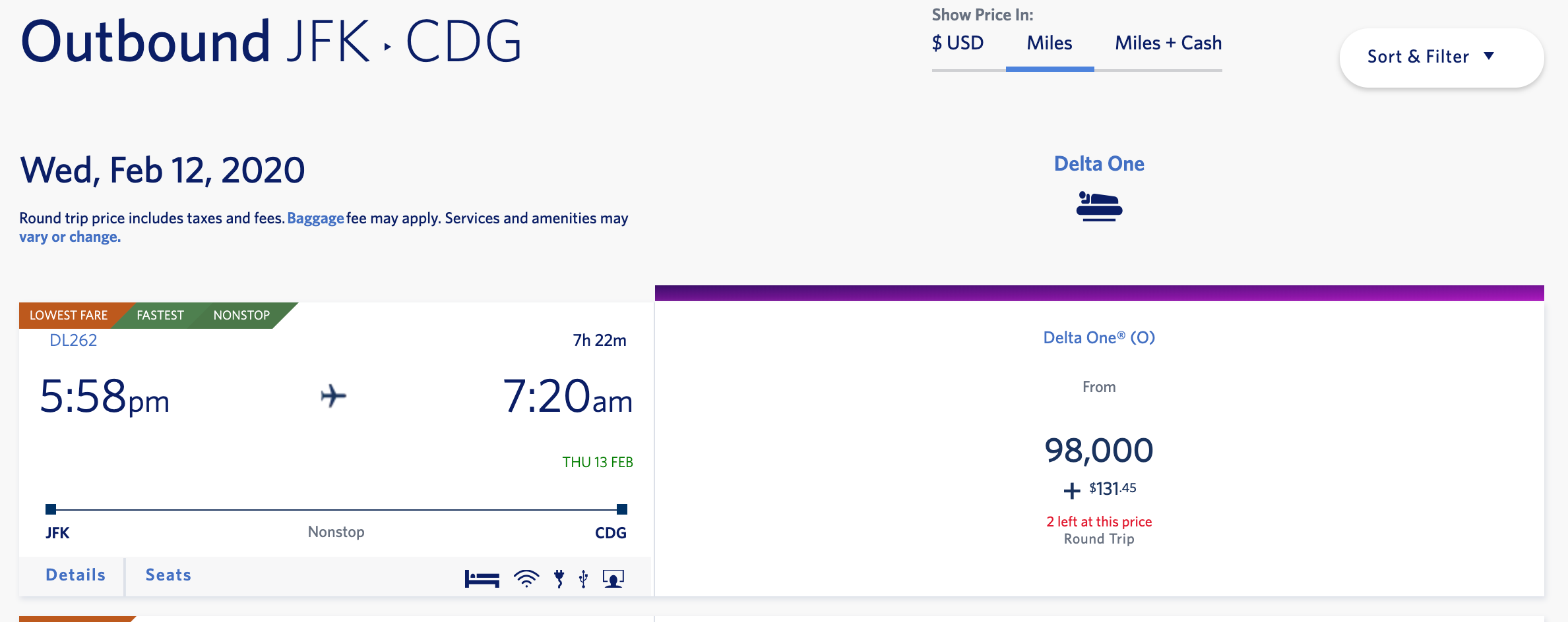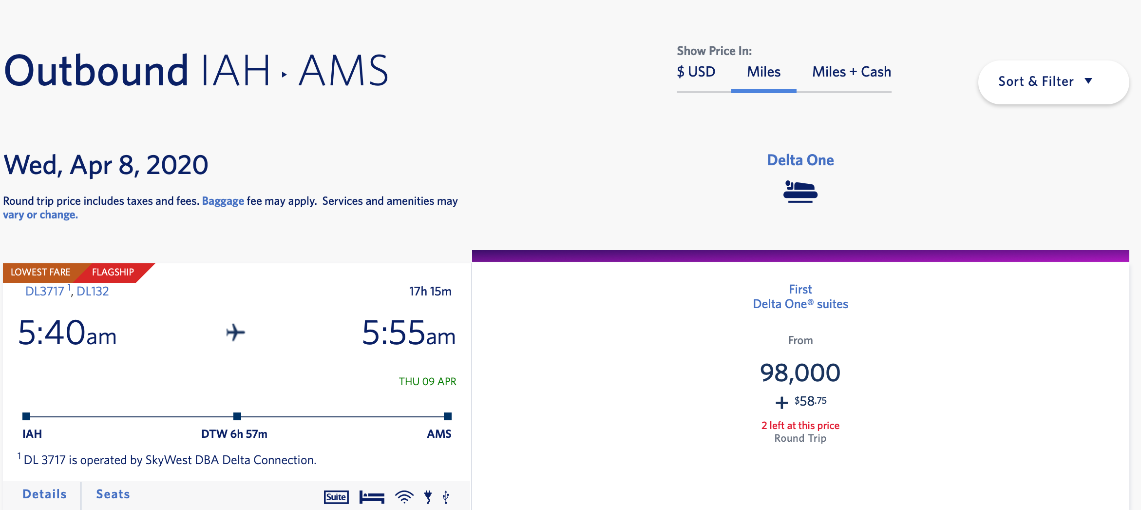 However, the true list is way longer than what Delta has posted. I found 98k business class options to Europe from many other cities including Houston (IAH), Los Angeles (LAX), etc. To see what is available in your area, simply search on Delta.com and use a flexible date view to spot the cheapest dates to fly upfront.