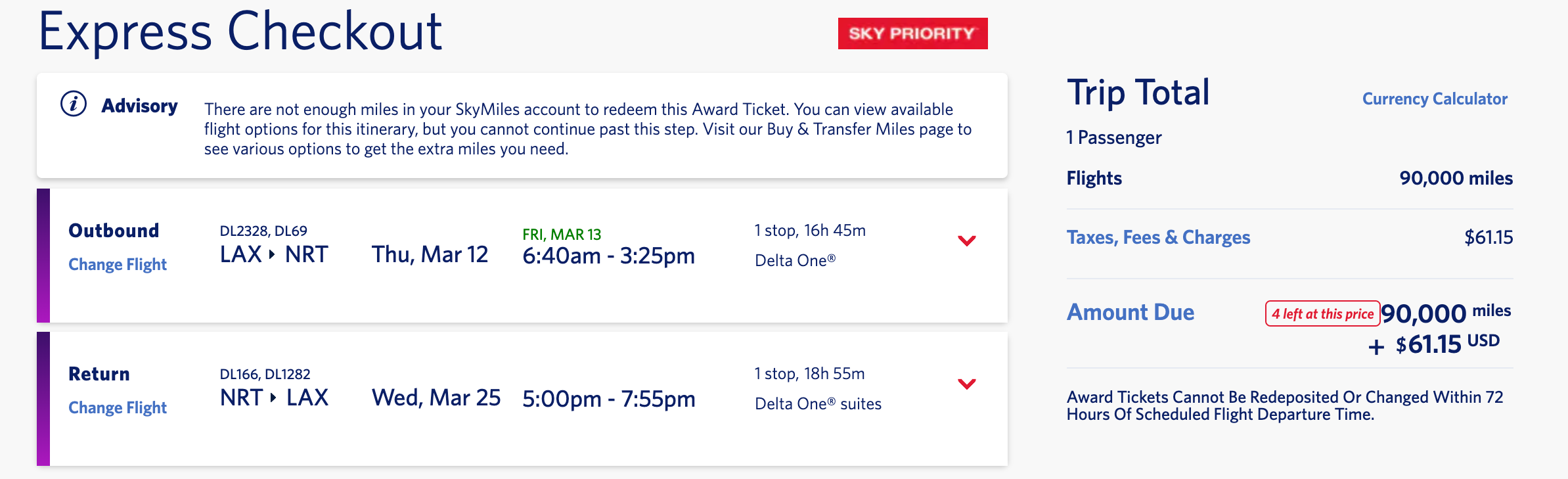 Los Angeles to Tokyo Narita for 90,000 miles + $61 in taxes and fees round-trip in Delta One (return leg in Delta One Suites):
