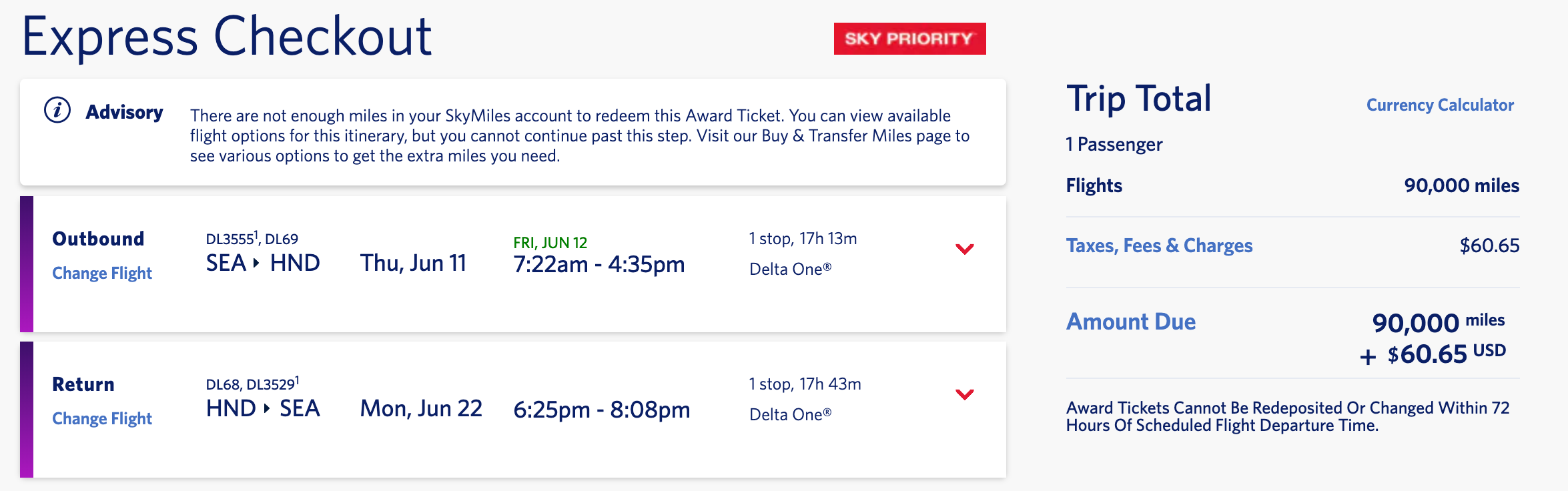 Seattle to Tokyo Haneda for 90,000 miles + $61 in taxes and fees round-trip in Delta One: