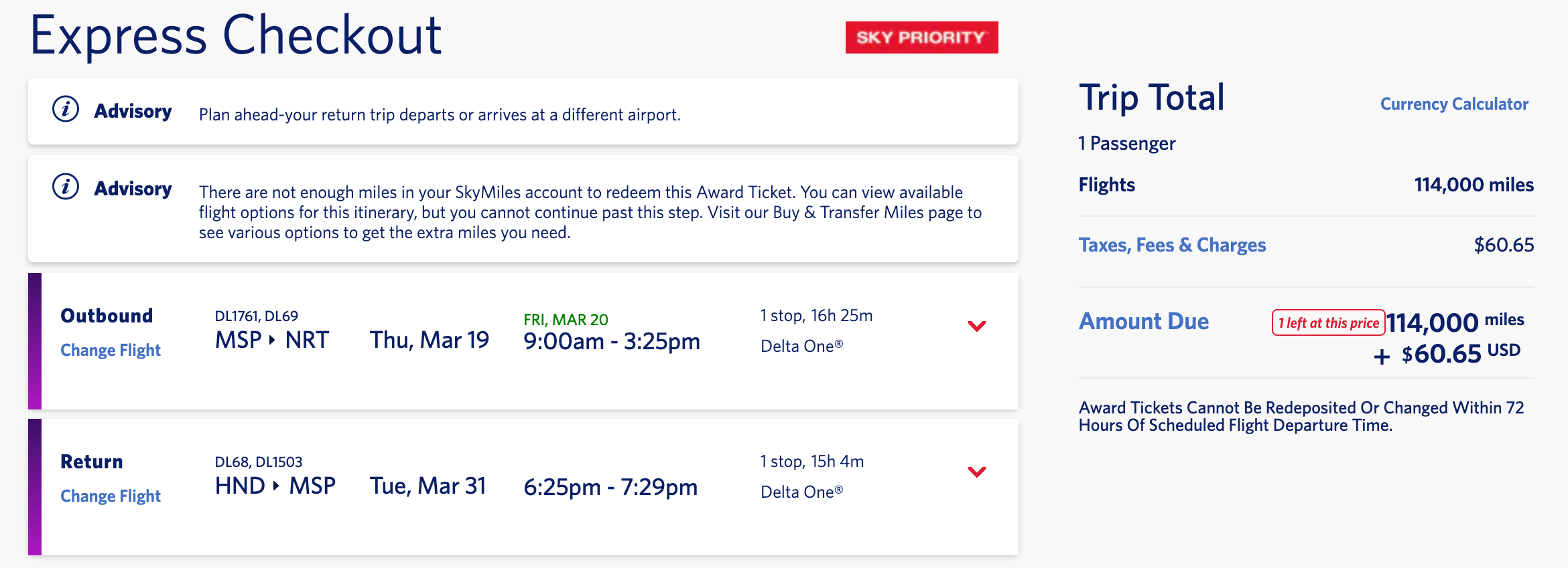 Minneapolis/St. Paul to Tokyo Narita, returning from Tokyo Haneda, for 114,000 miles + $61 in taxes and fees round-trip in Delta One: