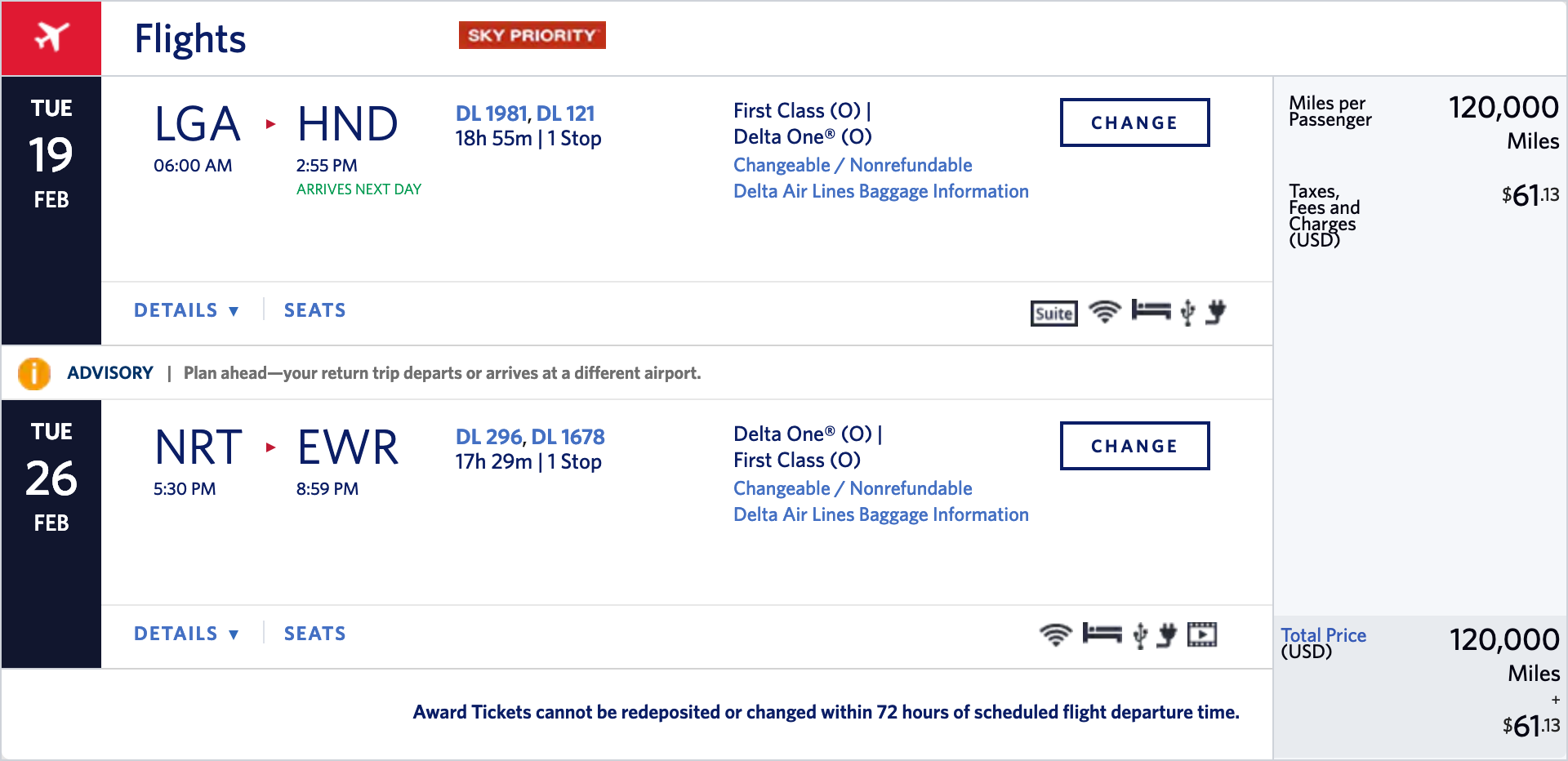 New York City (LGA/EWR) to Tokyo (HND/NRT) in Delta One Suites for 120,000 SkyMiles (+$62 Taxes/Fees) round-trip in February: