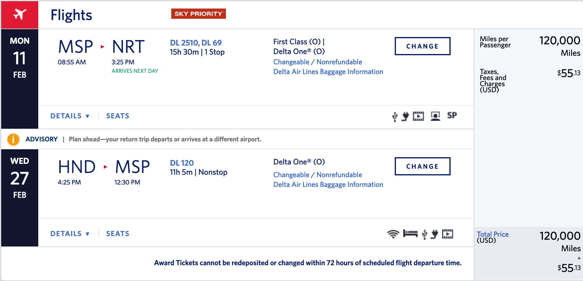 Minneapolis, MN (MSP) to Tokyo (NRT/HND) nonstop/one-stop in Delta One Suites for 120,000 SkyMiles (+$56 Taxes/Fess) round-trip in February: