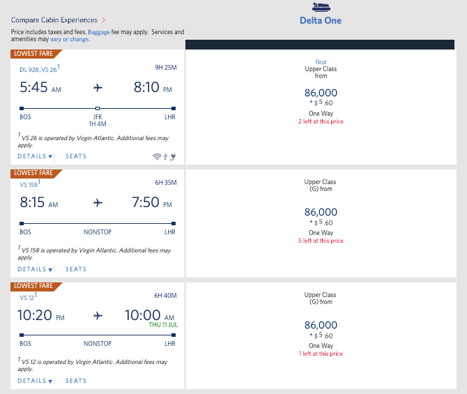 Boston (BOS) to London (LHR) for 86,000 miles + $56 in taxes and fees one-way nonstop with Virgin Atlantic: