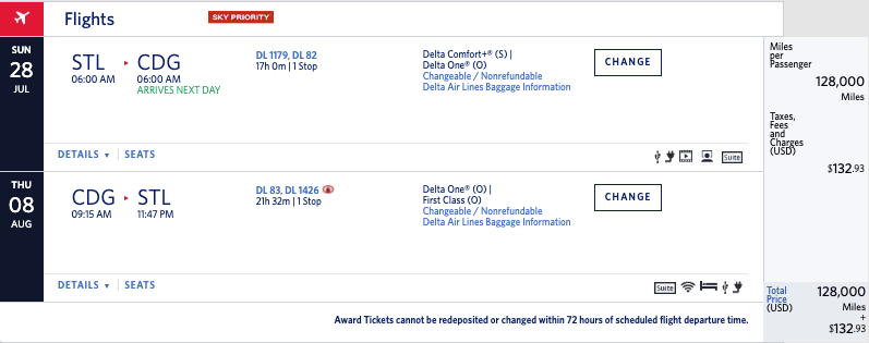 St. Louis (STL) to Paris (CDG) for 128,000 miles + $133 in taxes and fees round-trip in Delta One Suites:
