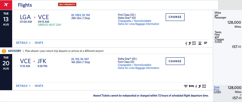 New York (LGA/JFK) to Venice (VCE) for 128,000 miles + $58 in taxes and fees round-trip: