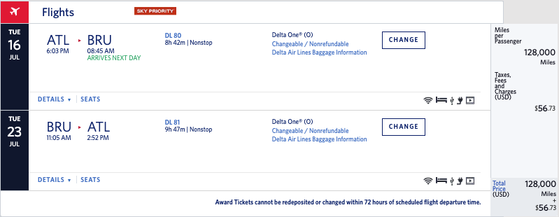 Atlanta (ATL) to Brussels (BRU) for 128,000 miles + $57 in taxes and fees round-trip: