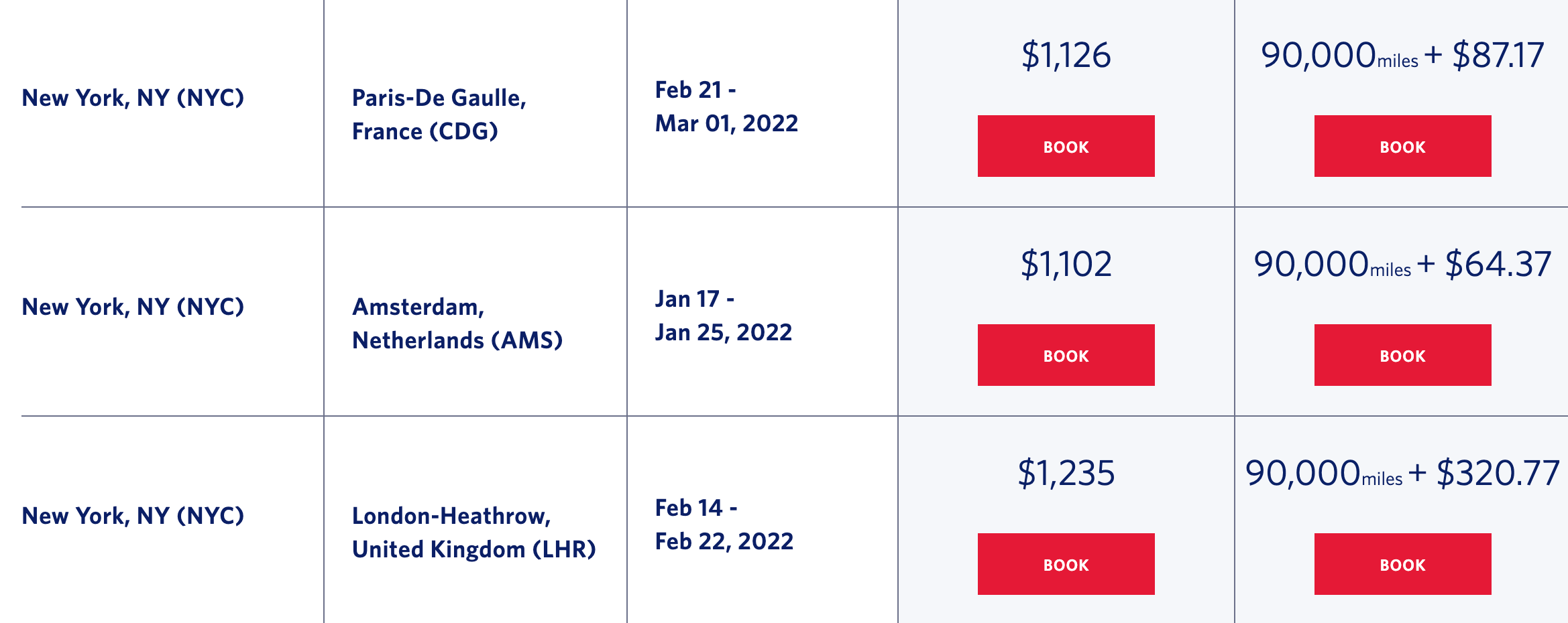 - New York City airports to Paris-De Gaulle (CDG), Amsterdam (AMS) and London-Heathrow (LHR) for 90,000 miles