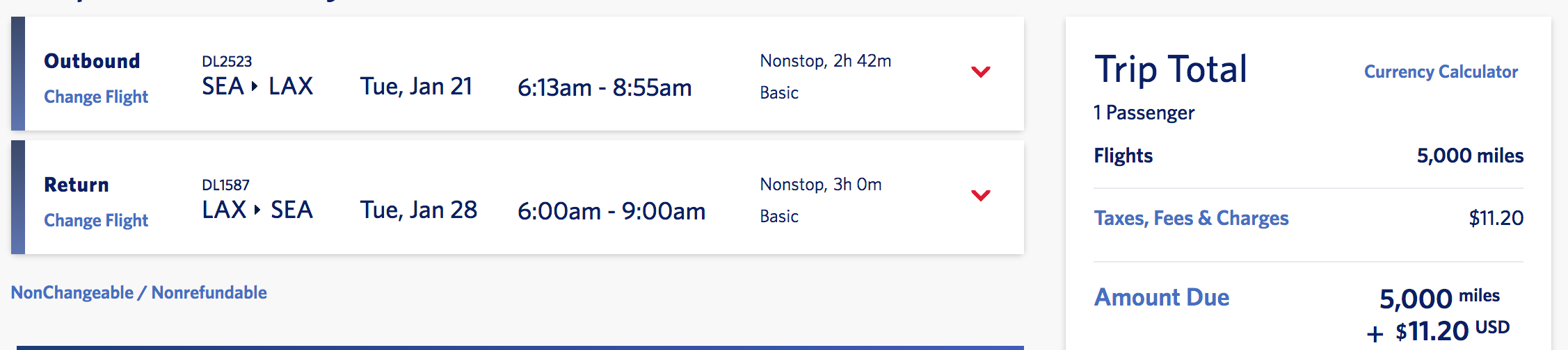 Seattle (SEA) to Los Angeles (LAX) for 5,000 SkyMiles + $11.20 round-trip nonstop in basic economy: