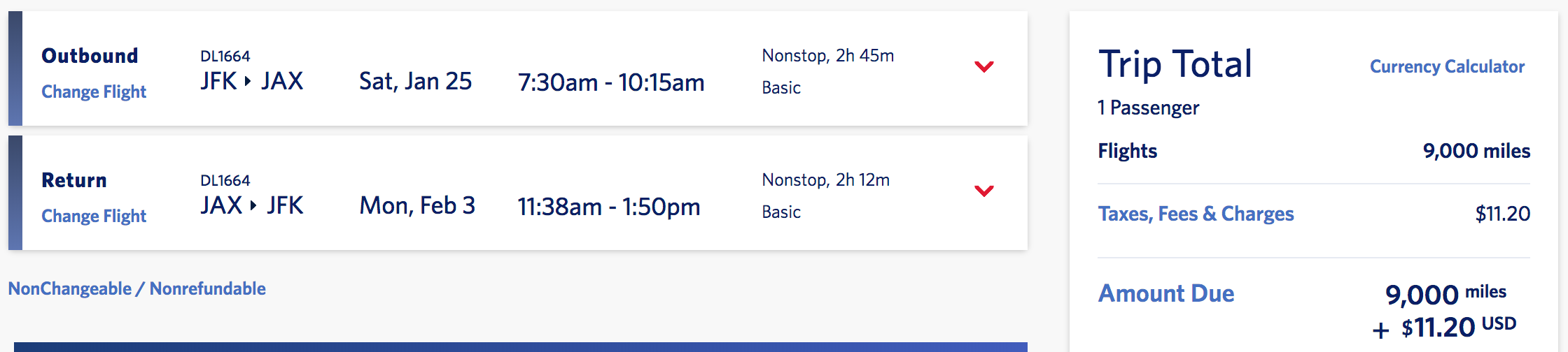 New York (JFK) to Jacksonville (JAX) for 9,000 SkyMiles + SkyMiles + $11.20 round-trip nonstop in basic economy: