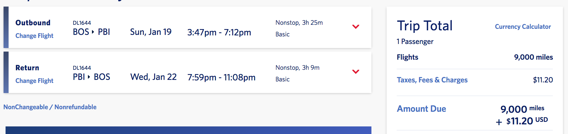 Boston (BOS) to West Palm Beach (PBI) for 9,000 SkyMiles + SkyMiles + $11.20 round-trip nonstop in basic economy: