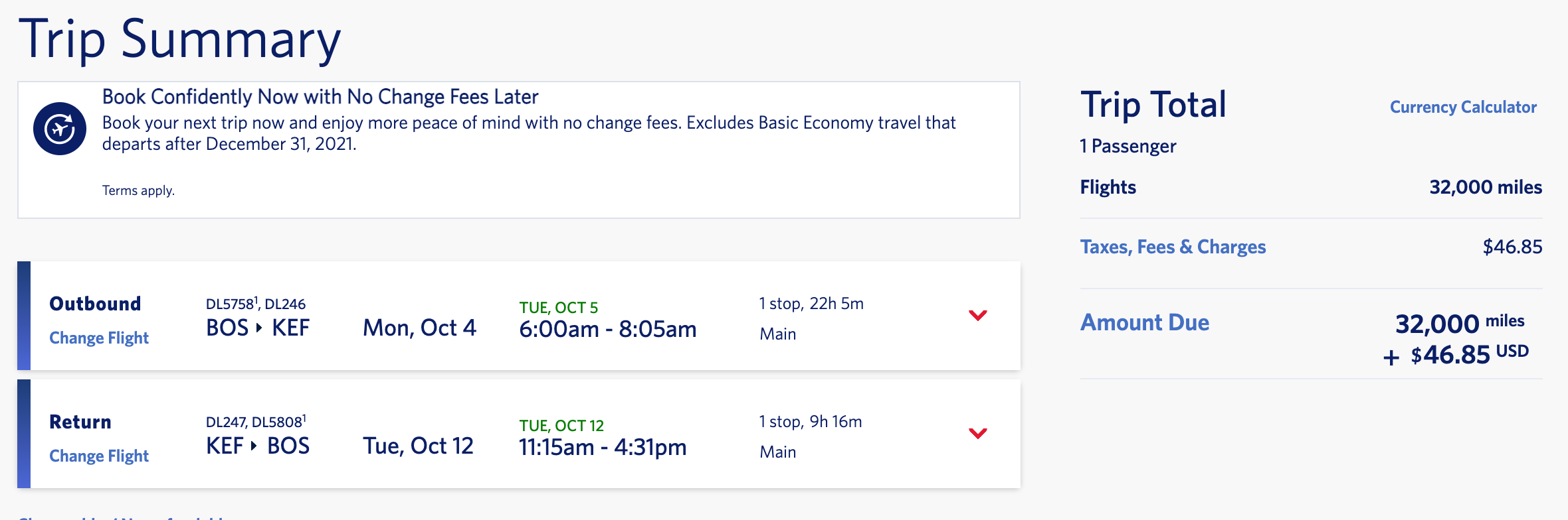 Boston (BOS) to Reykjavik (KEF) for 32,000 SkyMiles and $47 in taxes and fees