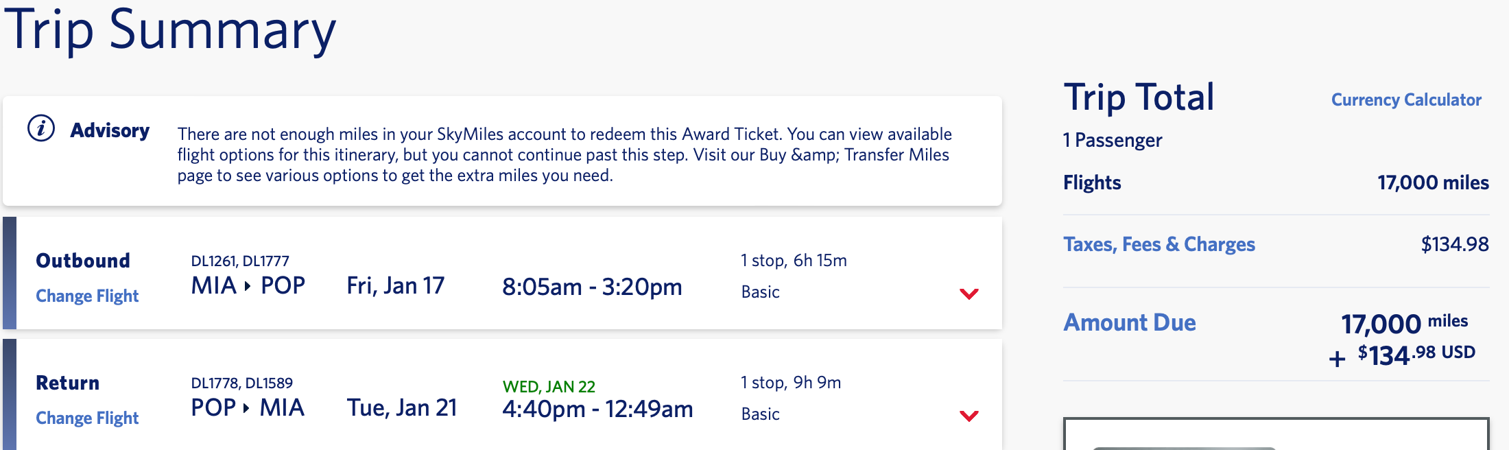 This round-trip itinerary from Miami International Airport (MIA) to POP is available for just 17,000 SkyMiles and $135 in taxes and fees. The cash price for this route right now is about $418.