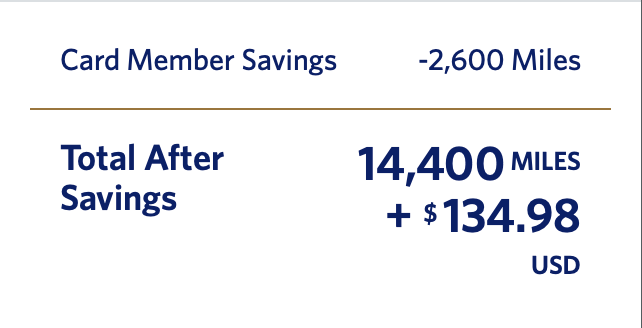 Using a Delta Amex cobranded card will give you an extra 15% off, bringing the cost of this trip to 14,400 SkyMiles plus taxes.