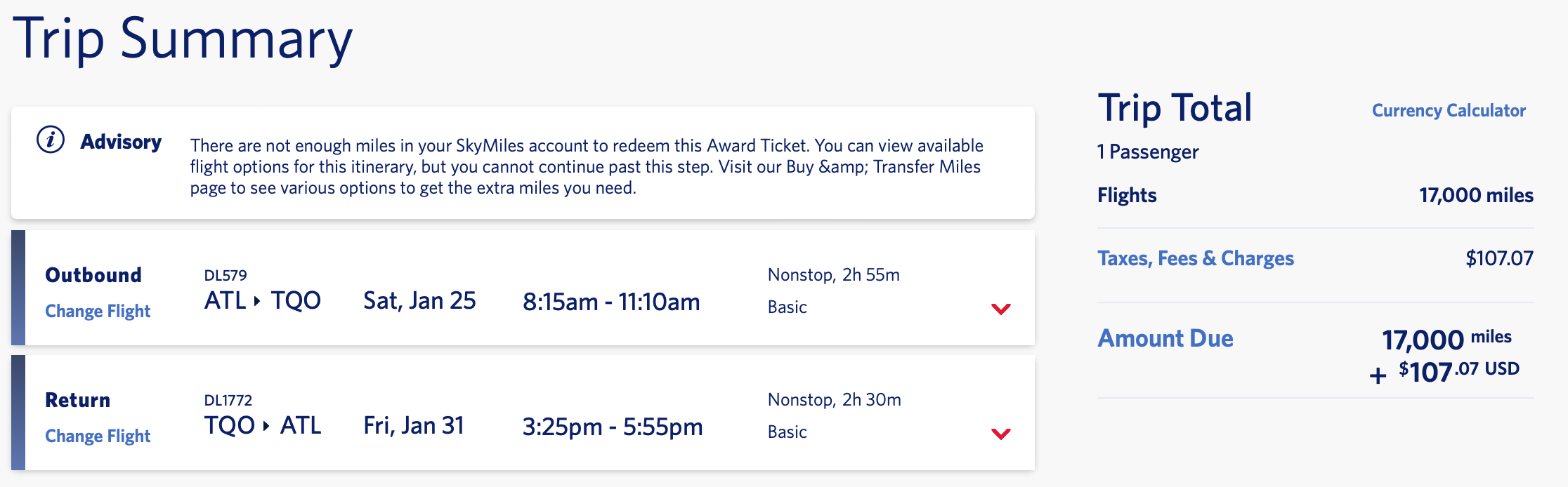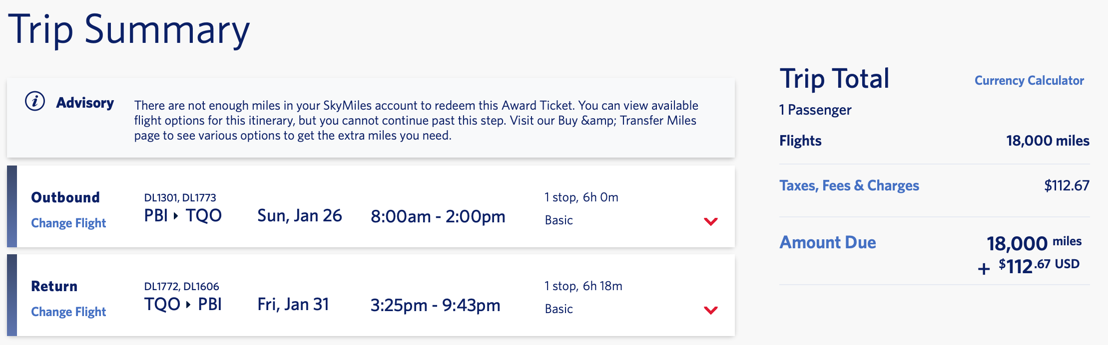 We found round-trip flights from Palm Beach International Airport (PBI) in West Palm Beach, Florida, to TQO for 18,000 SkyMiles and $113 in taxes and fees. The cash price for this round-trip ticket would cost you $466.