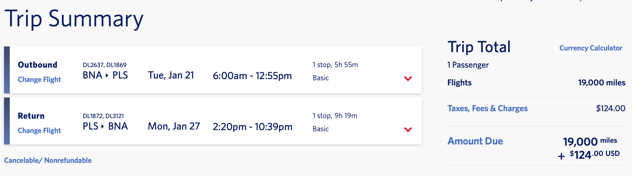 Another option out of the South is this flight from Nashville International Airport (BNA) to PLS. It's available for 19,000 SkyMiles and $124 in taxes. Using a Delta Amex cobranded card would reduce the total to 16,100 SkyMiles.