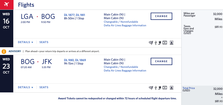 New York (LGA/JFK) to Bogota (BOG) for 32,000 miles + $82 in taxes and fees round-trip in economy: