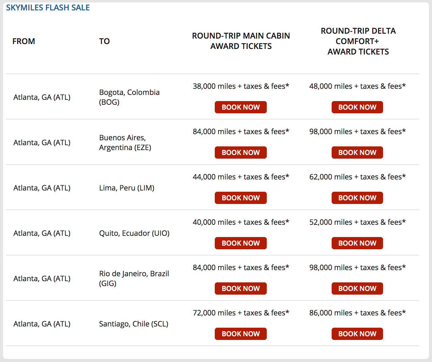 Those who have been holding off for a flash sale to South America should act fast. Delta has quietly launched a 48-hour SkyMiles sale to Bogota, Buenos Aires, Lima, Rio de Janeiro, Santiago and Quito. The deal includes Main Cabin (economy) and Comfort+ (extended legroom economy) seating on flights connecting through Delta's headquarters in Atlanta.