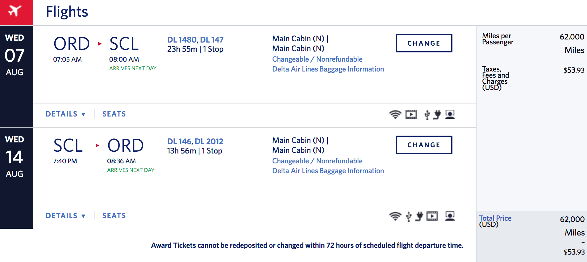 Chicago (ORD) to Santiago (SCL) for 62,000 miles + $103 in taxes and fees round-trip in economy: