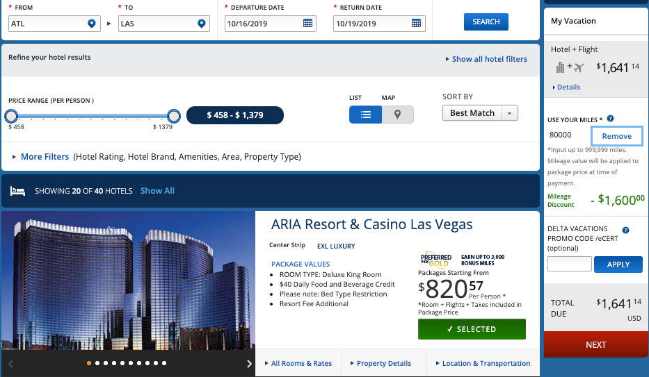 Fellow TPG staff members came across numerous instances where prices for Delta Vacations were actually better than booking flights and hotels separately. As an example, this Atlanta to Las Vegas (LAS) trip — including a three-night stay at the Aria Resort & Casino — is pricing at $1,641.14 for two adults, or 82,057 miles in the current promotion: