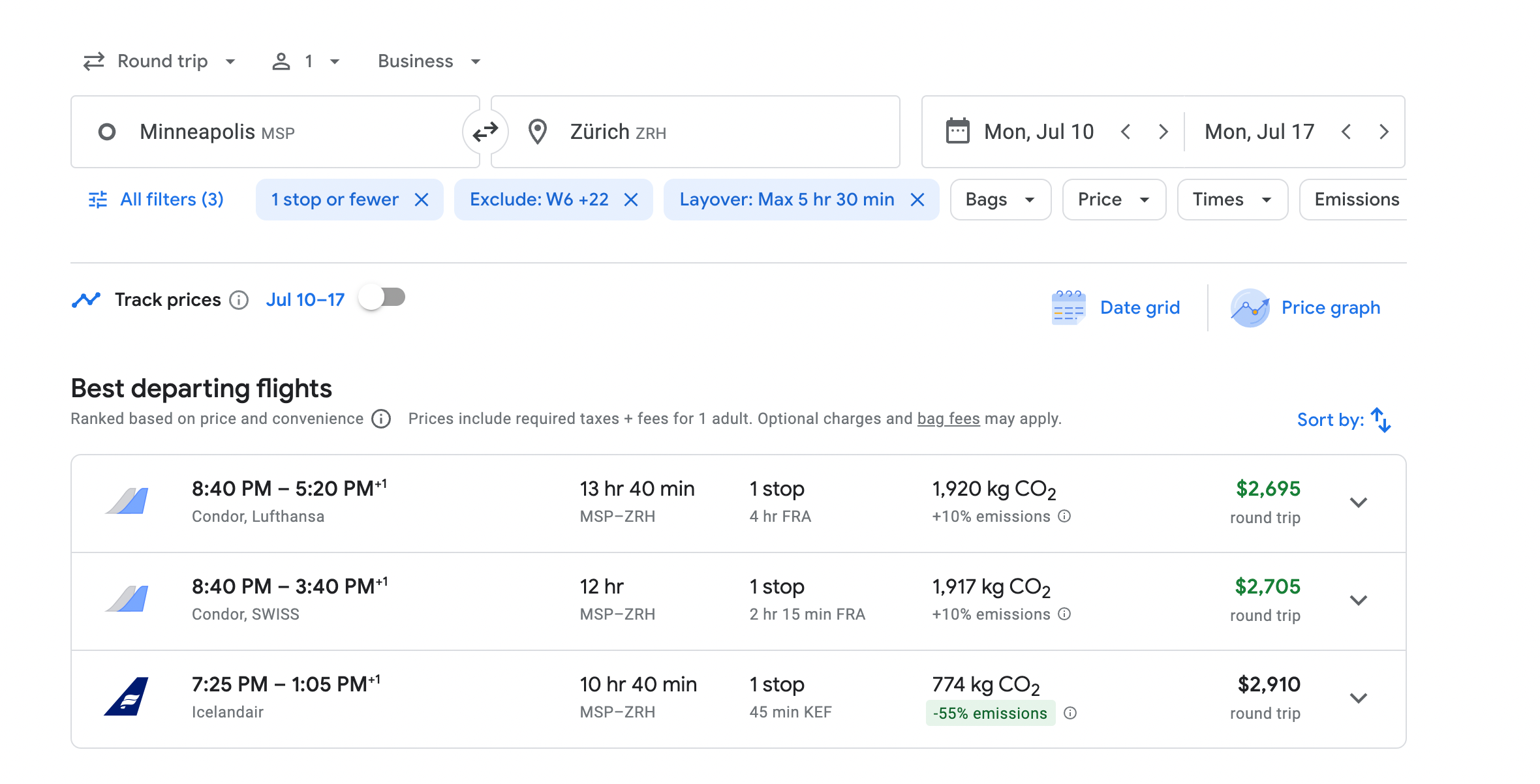 For a July 10 flight from Minneapolis to Zurich, the Condor flight is the cheapest available business-class option on Google Flights — many of the other options cost upward of $4,000.