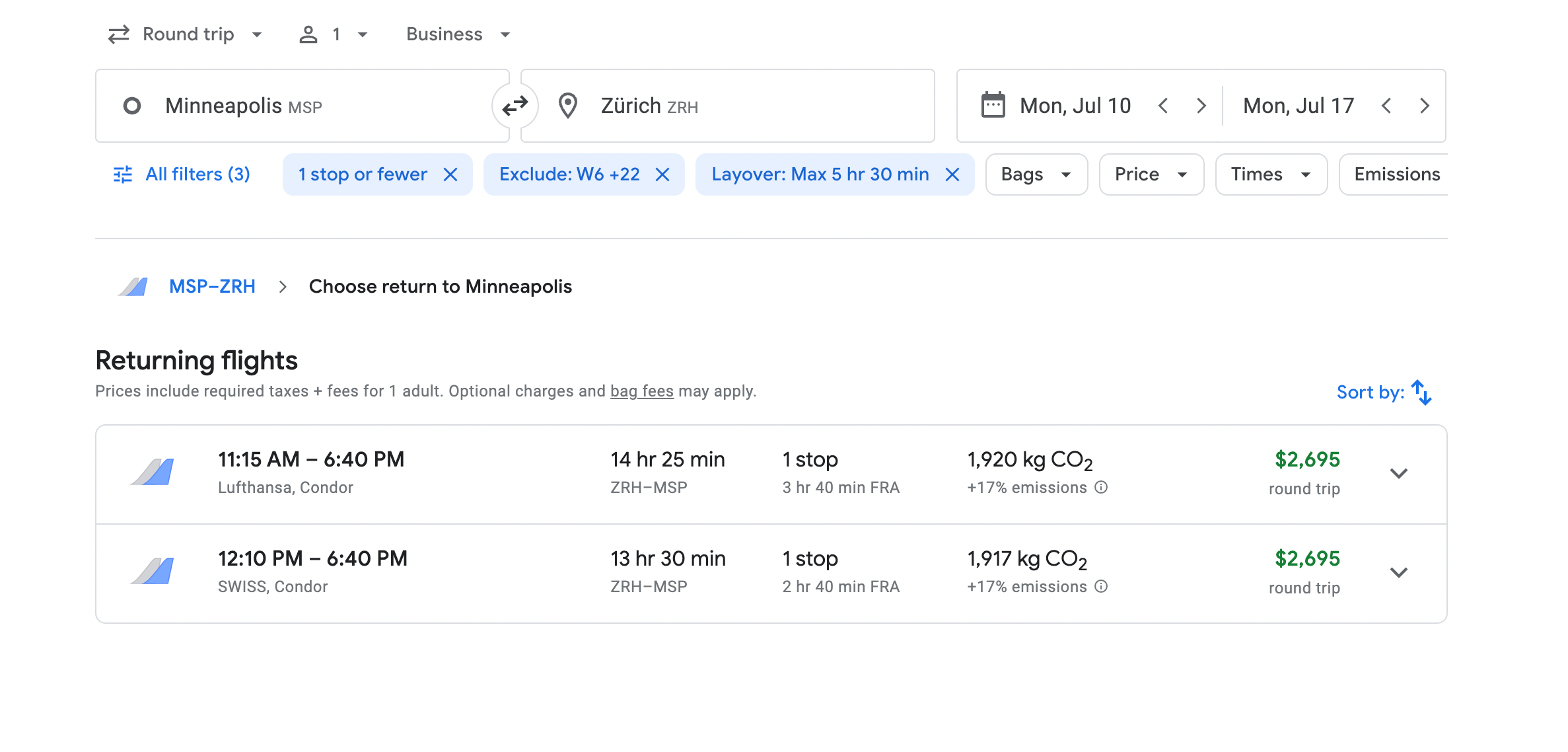 Condor also offers a return flight from Zurich on July 17 which would keep the fare at around $2,700. Both flights to and from Zurich have layovers in Frankfurt.