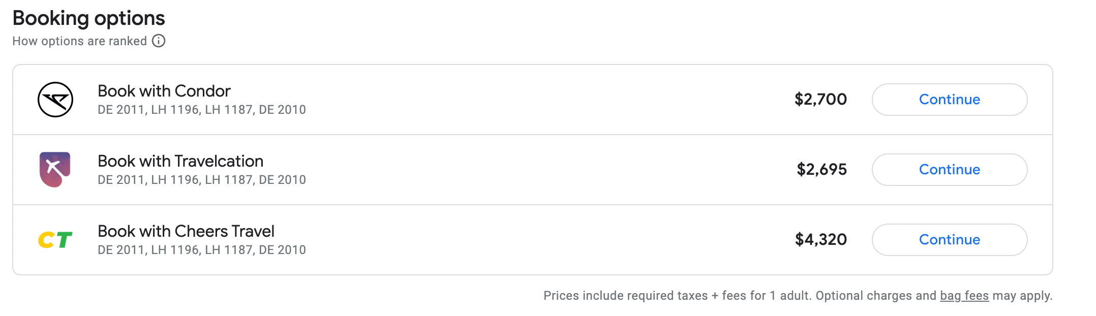 We recommend finding your ideal dates through Google Flights and then booking your flights directly on the airline's website since airlines are more reliable in the event your flight faces a delay, cancellation or booking change.