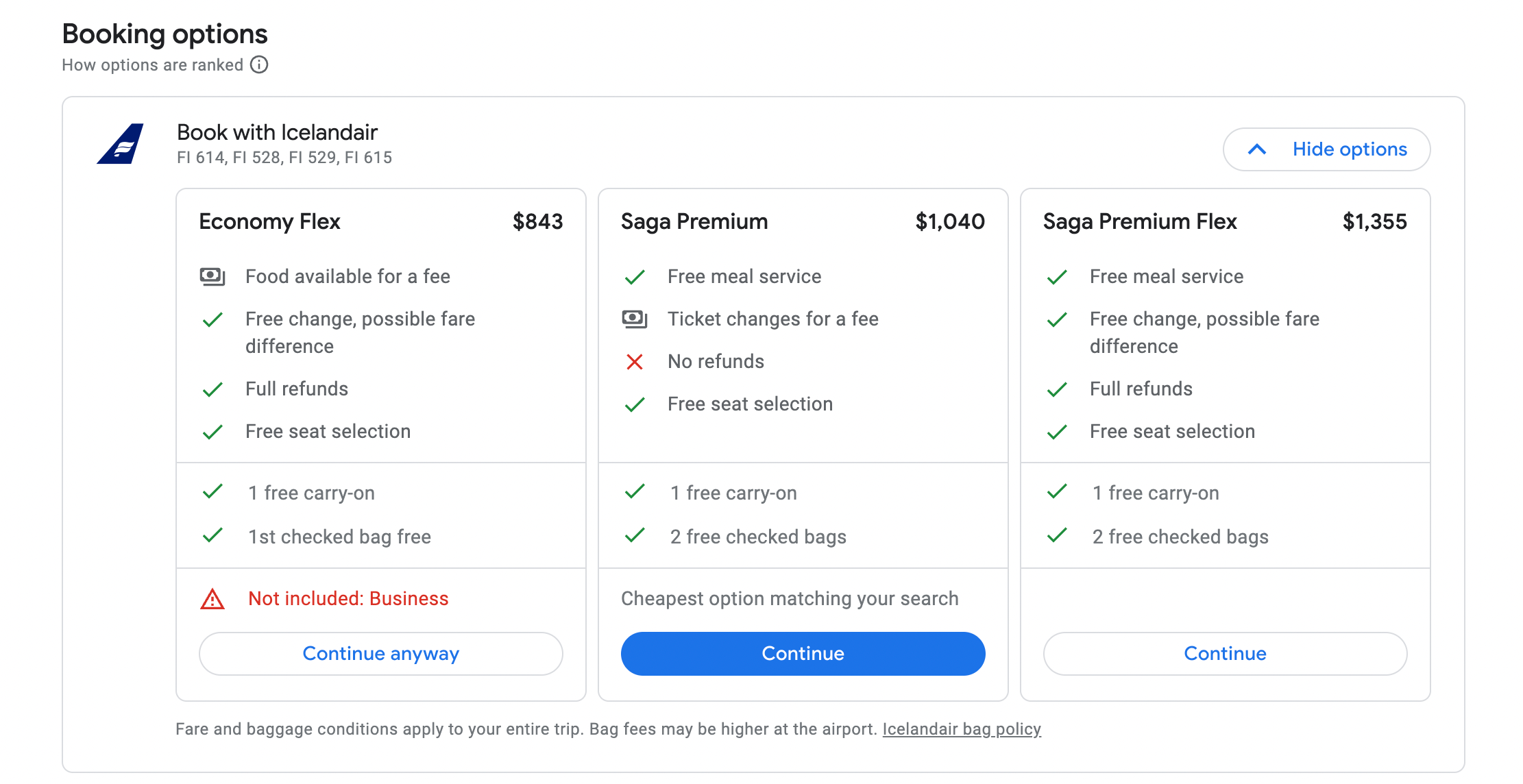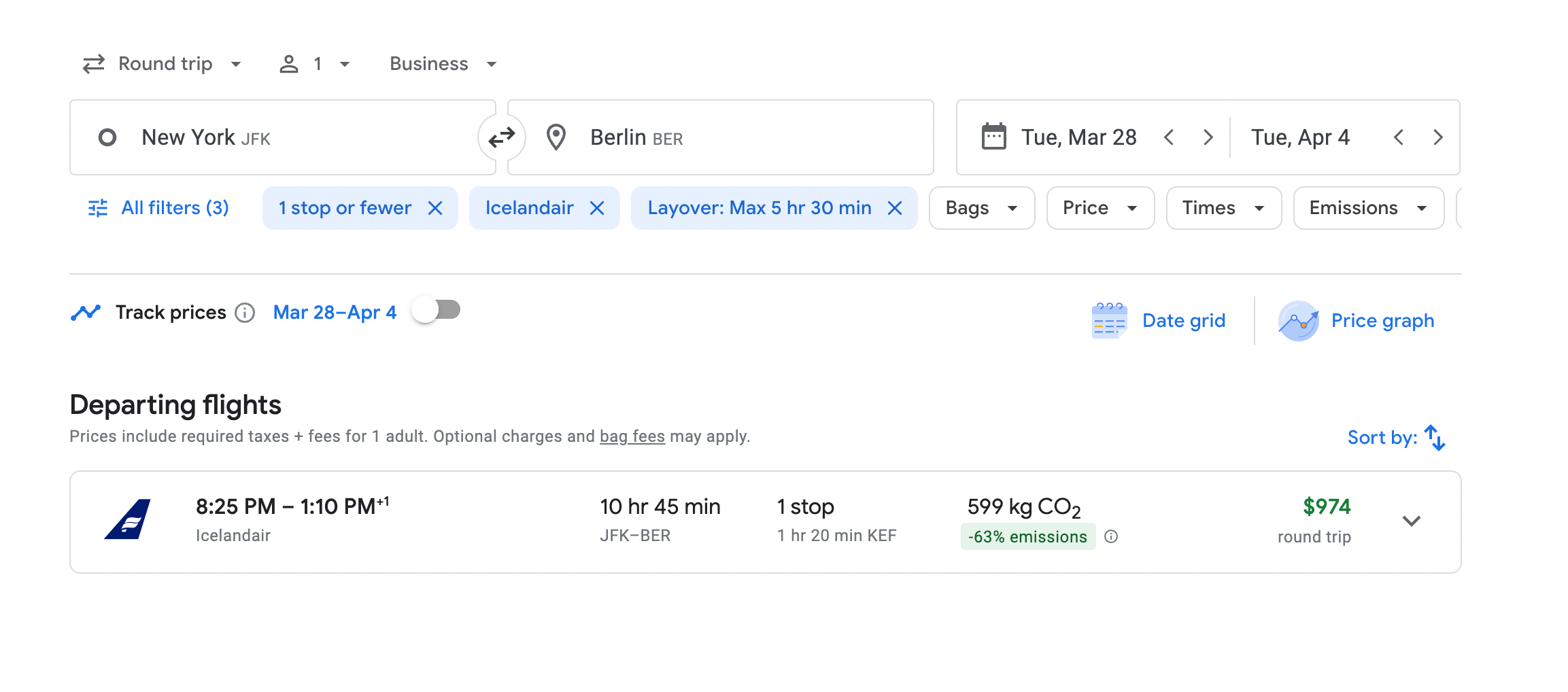 While Google Flights shows the round-trip fare price from JFK to Berlin as $974, the flights actually cost $1,040 if you book directly on Icelandair's website. Sometimes prices on Google Flights differ from those on airlines' websites due to the availability of third-party options. For this route, Google Flights gives the option to book with numerous third-party sites.